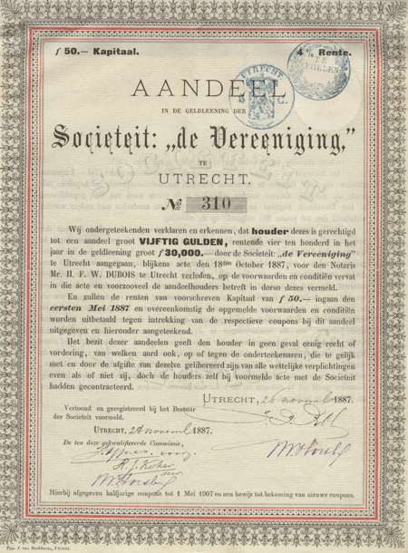 Over de oprichting van “De Vereeniging” is niet zo heel veel bekend. Zoals vaker in dit soort gevallen zullen er mensen met ideeën hebben rondgelopen en ineens is het zover. “De Vereeniging” zelf herleidt haar geschiedenis tot 1869, maar officieel bestaat de sociëteit ‘pas’ sinds 16 maart 1872, de dag waarop de statuten door koning Willem III bij Koninklijk Besluit werden goedgekeurd. In het Introductieboek, dat heden ten dage dienst doet als inschrijfboek voor nieuwe leden, is sprake van een eerste (?) bijeenkomst op 7 november 1869. Een ander “bewijs” zijn de aandelen, in feite obligaties, uitgegeven in 1887.